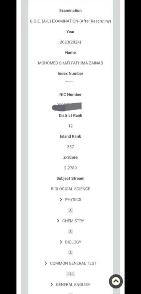 “සර්, මම ෂෙයිනබ්. සර්ට ප්රතිඵල කියන්න කතා කළේ. දිස්ත්රික් රෑන්ක් එක 12. මෙඩිසින් යන්න පුළුවන්…”