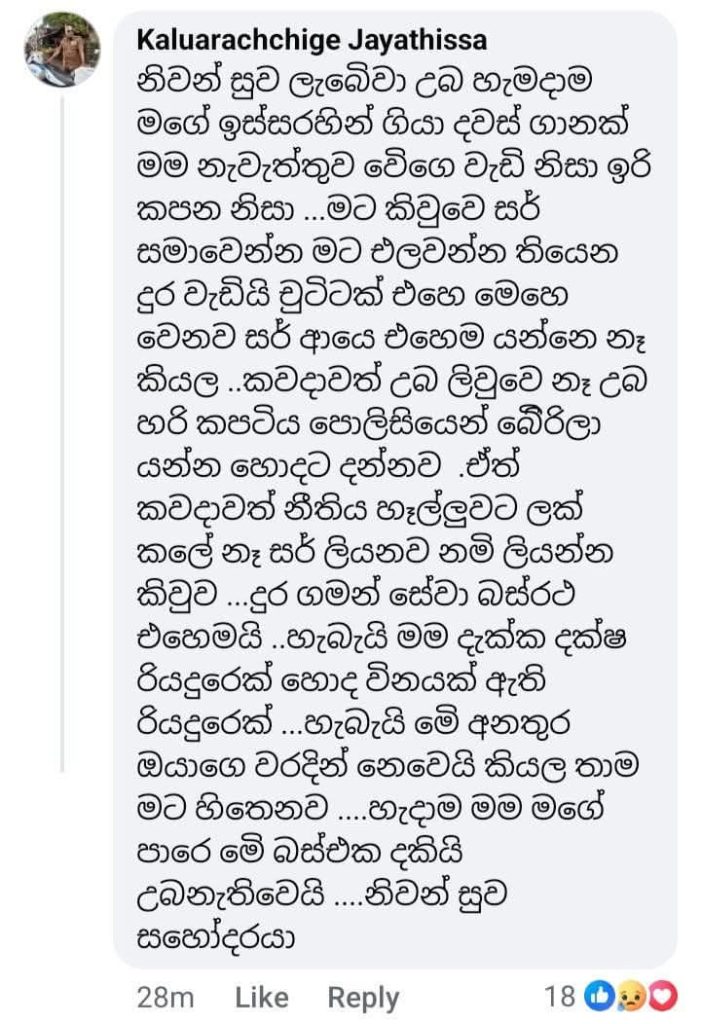 දුර ගමන් සේවා බස්‌රථ එහෙමයි .හැබැයි මම දැක්ක දක්ෂ රියදුරෙක් හොද විනයක් ඇති රියදුරෙක් …හැබැයි මේ අනතුර ඔයාගේ වරදින් නෙවෙයි කියල තාම මට හිතෙනව ….