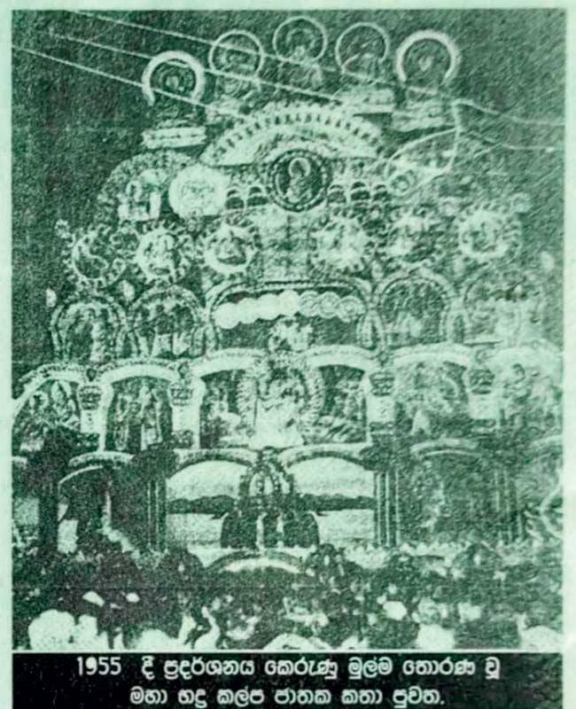 පළමු වෙසක් තොරණ ලෙස 1955 වර්ෂයේ ඉදිකරන ලද තොරණට පාදක වුණේ මහා භද්රකල්ප ජාතක කතා පුවතය. අඩි 105ක් පමණ උසින් යුත් එම තොරණට විදුලි බුබුළු දෙලක්ෂ පනස්දහසක් පමණ යොදාගෙන ආලෝකමත් කර තිබුණි