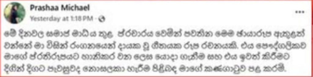 ”මේ දිනවල සමාජ මාධ්‍ය තුළ ප්‍රචාරය වෙමින් පවතින මෙම ඡායාරූප ඇතුළත් වන්නේ මා විසින් රංගනයෙන් දායක වූ ගීතයක රූප රචනයකි. එය පෞද්ගලිකව මාගේ ප්‍රතිරූපයට හානිකර වන ලෙස යොදා ගැනීම සහ එය ඉවත් කිරීමට දිගින් දිගට පැවසුවද නොසලකා හැරීම පිළිබඳ මාගේ කණගාටුව පළ කරමි.”